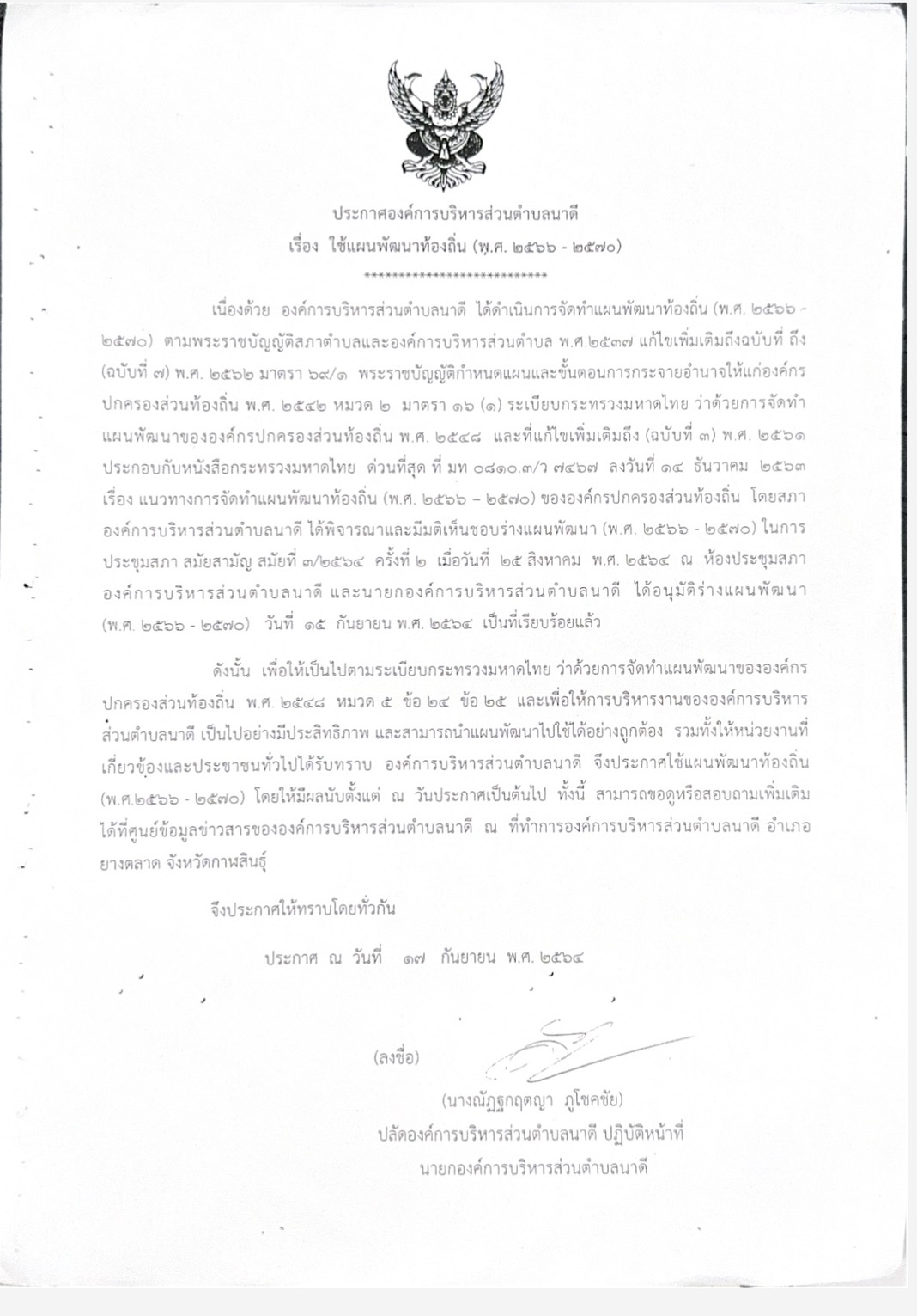 ประกาศแผนพัฒนาท้องถิ่น (พ.ศ.2566-2570) องค์การบริหารส่วนตำบลนาดี